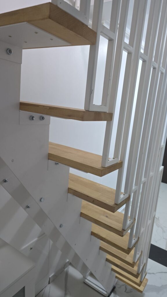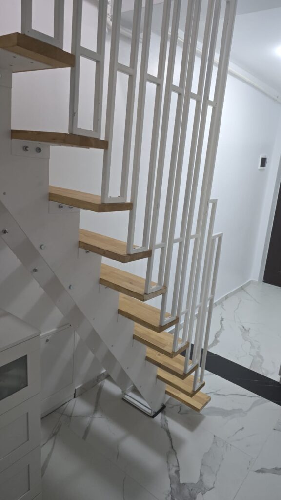 Scara a fost gândită pentru un spațiu interior luminos, cu finisaje moderne. Beneficiarul și-a dorit o soluție minimalistă, dar solidă, care să se încadreze perfect în ambientul alb și aerisit al locuinței.