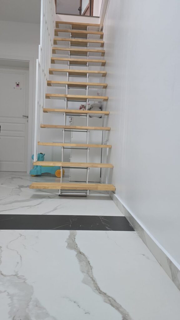 🧱 Întreaga scară se încadrează perfect în spațiul decorat cu gresie porțelanată albă cu venaturi fine